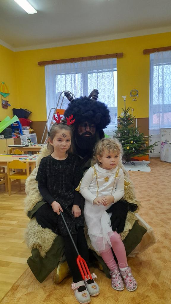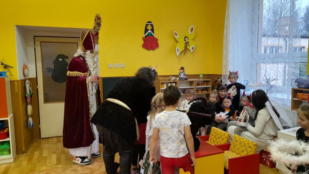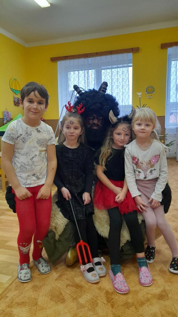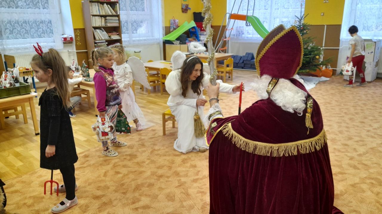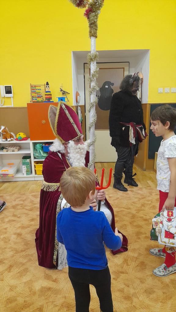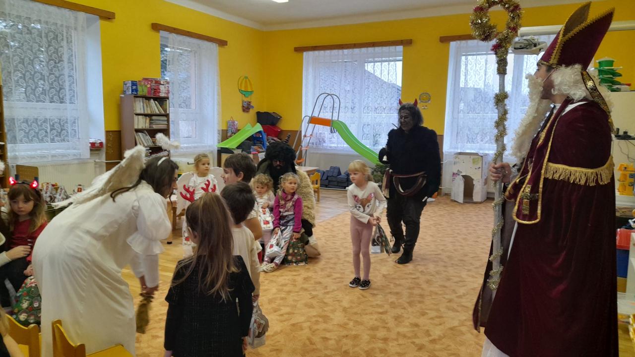 V pátek 5.12.2025 do naší školky zavítal Mikuláš s andílky a čerty. Když dorazili, byly děti trošičku vystrašené, ale pak díky vlídnému přístupu Mikuláše, andílků i čertů bylo vše jak v pohádce. Mikuláš si od dětí vyslechl básničky a andílky pověřil rozdáváváním sladkostí. Čerti dělali neplechu a bavili přitom děti různými žertíky. Velký čert, kterému jsem říkali Lucifer, se snažil děti zbavit strachu z čertů a byl velice vlídný a zábavný, děti si s ním užily hodně legrace, když ho drbaly na zádech. Byly to příjemně strávené chvíle, velice všem děkujeme a doufáme, že se příště zase setkáme.