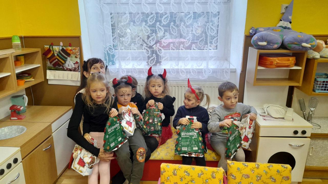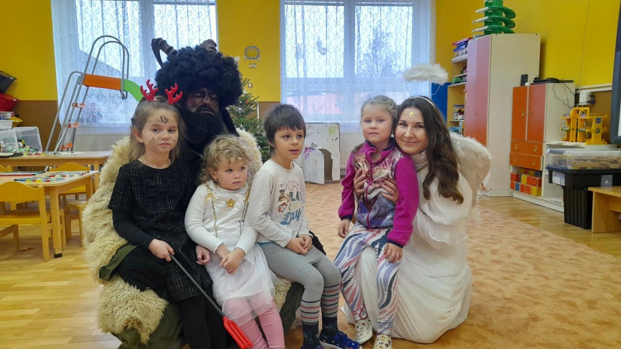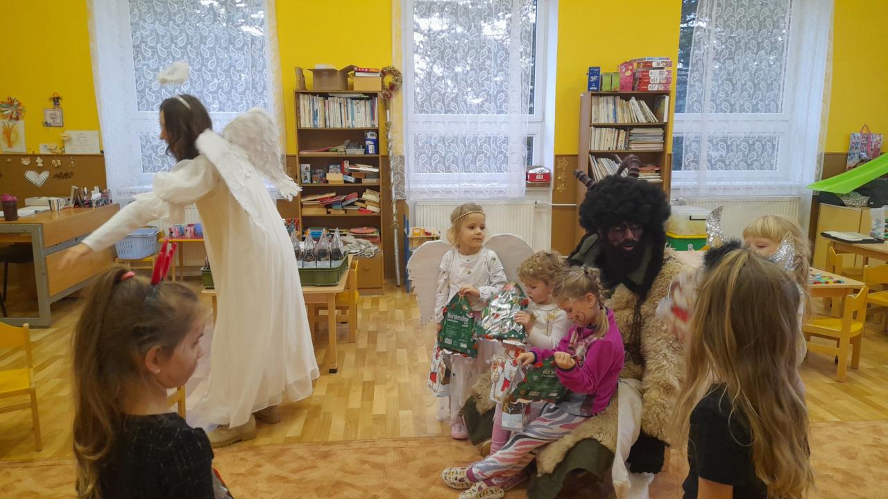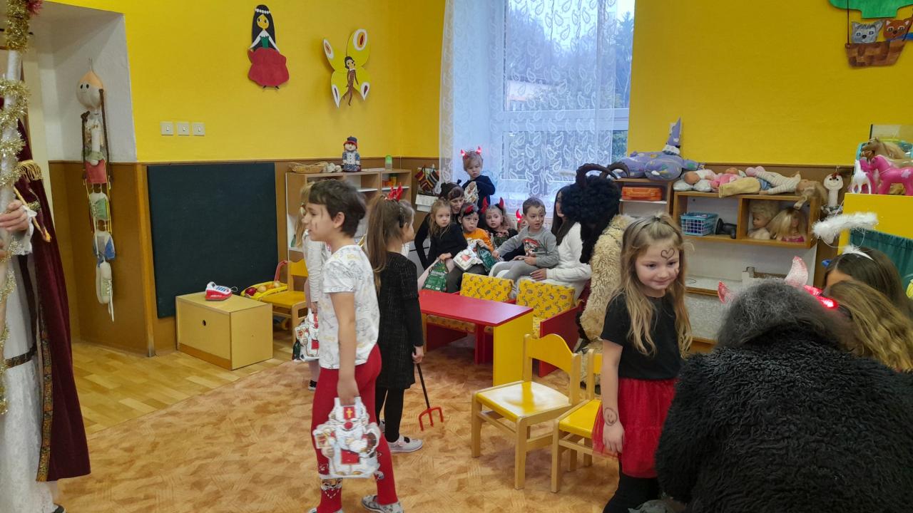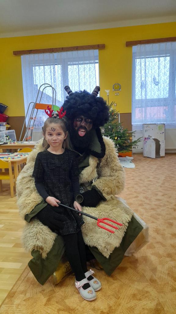 V pátek 5.12.2025 do naší školky zavítal Mikuláš s andílky a čerty. Když dorazili, byly děti trošičku vystrašené, ale pak díky vlídnému přístupu Mikuláše, andílků i čertů bylo vše jak v pohádce. Mikuláš si od dětí vyslechl básničky a andílky pověřil rozdáváváním sladkostí. Čerti dělali neplechu a bavili přitom děti různými žertíky. Velký čert, kterému jsem říkali Lucifer, se snažil děti zbavit strachu z čertů a byl velice vlídný a zábavný, děti si s ním užily hodně legrace, když ho drbaly na zádech. Byly to příjemně strávené chvíle, velice všem děkujeme a doufáme, že se příště zase setkáme.