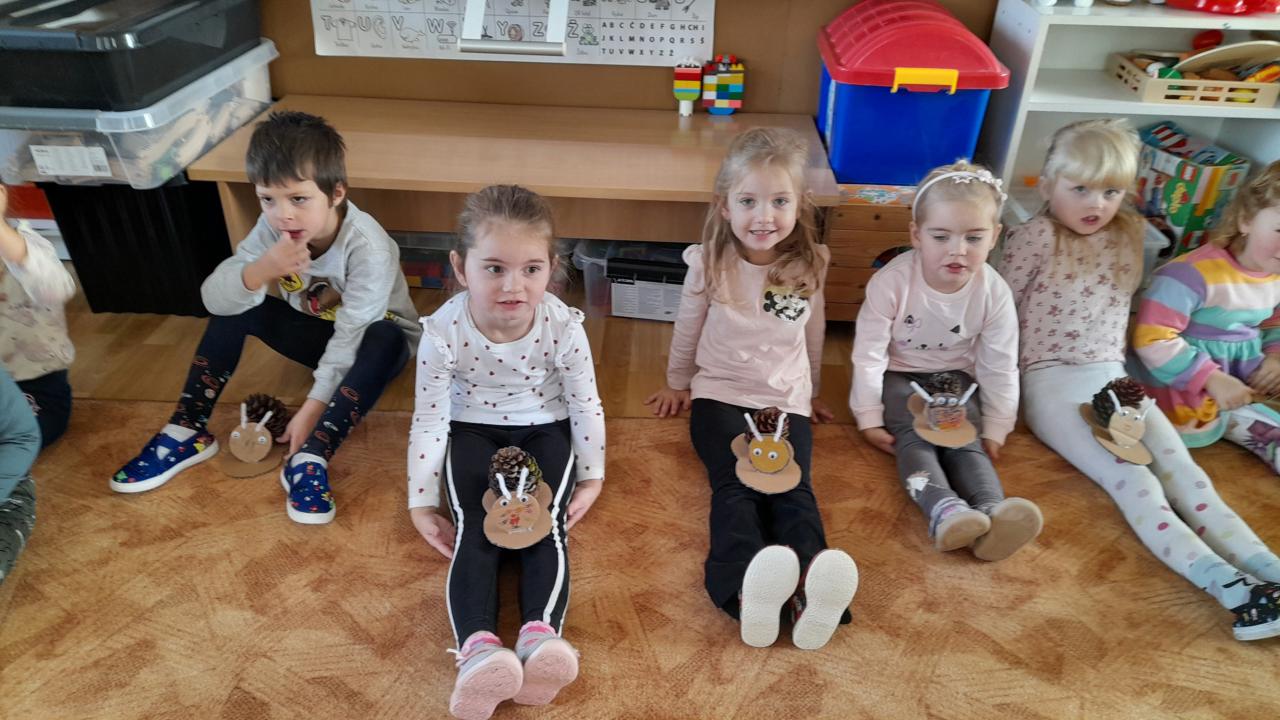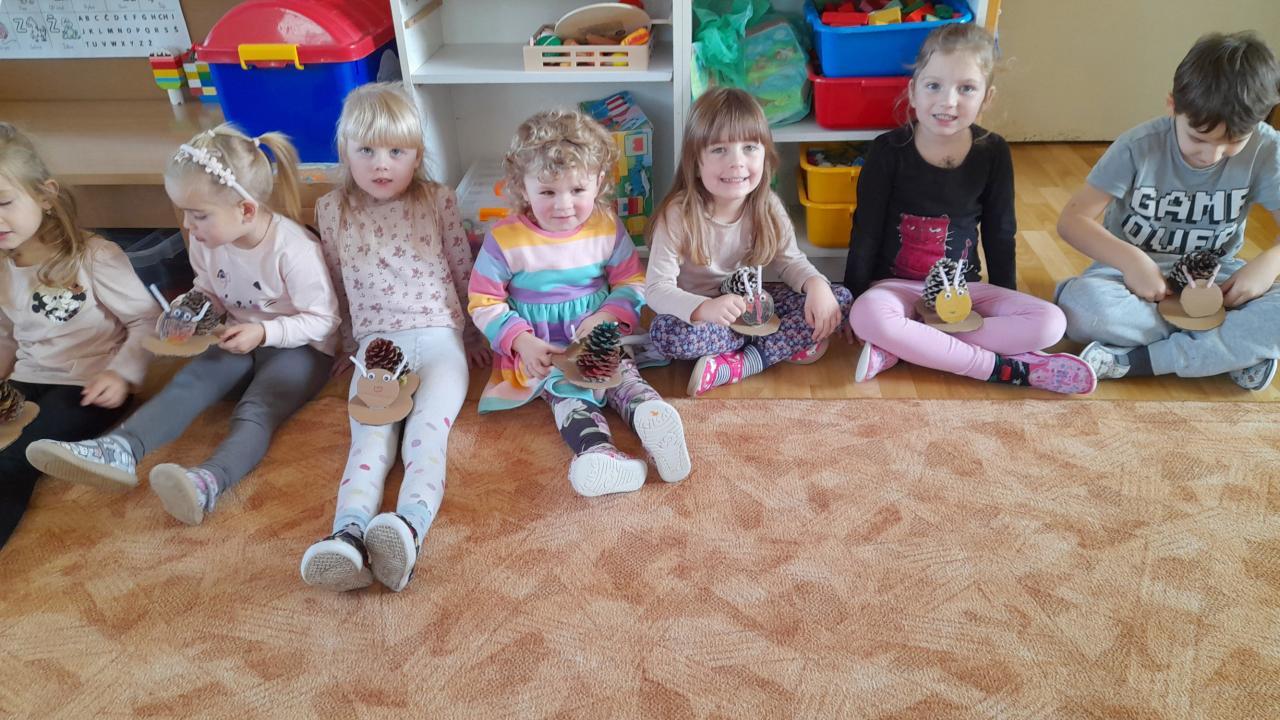 V týdnu od 10.11. do 14.11.2025 jsme se s dětmi věnovali tvoření. Obarvovali jsme šišky, vystřihávali kolečka, lepili očička, vybarvovali, lepili tavnou pistolí. Nakonec nám ze vší té práce vyšel šnek. Děti si práci hodně užívaly-nejvíce je bavilo obarvování šišek.