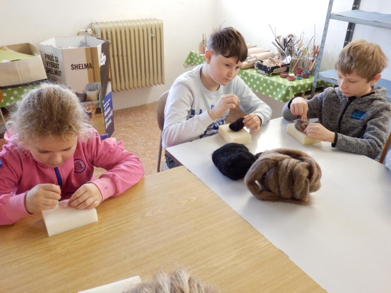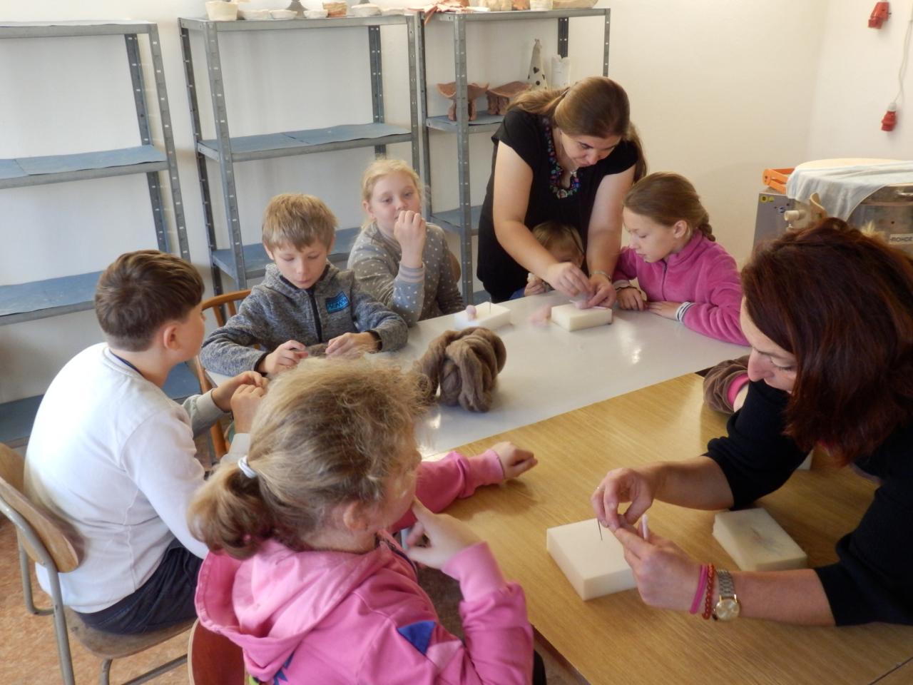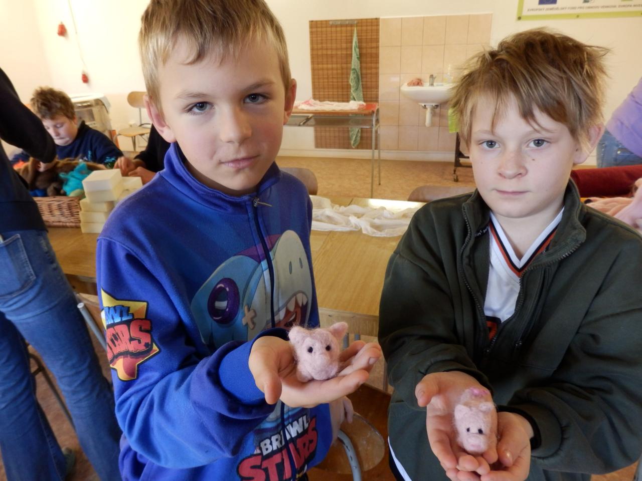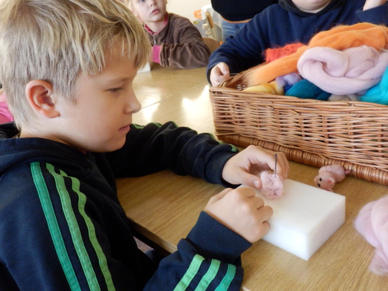 Na úvod paní lektorka Komárková žáky seznámila s materiálem, se kterým budou pracovat. Jednalo se o vlnu z ovcí, která se vyrábí ze surové vlny mykáním. Vlna pak může být přírodní, nebo se může obarvit. Žáci si poté vlnu prohlédli a „osahali“. Pak již následoval výběr toho, co budou vyrábět. Děvčata si vybírala většinou panenku, chlapci spíše zvířátka (prasátko, lišku, kravičku či medvěda). Žáci si vzali obarvenou vlnu, speciální jehlu s háčky, molitanovou podložku a pustili se s chutí do práce – plstění. Během plstění se občas každý jehlou píchl do prstu, ale nakonec výsledkem jejich práce byla hezká zvířátka či panenky-andělky.