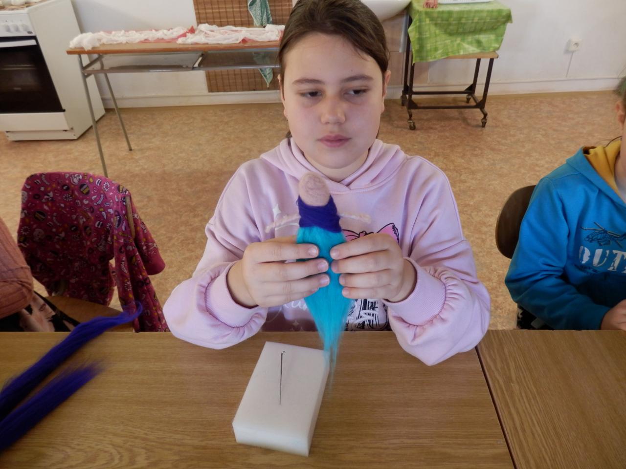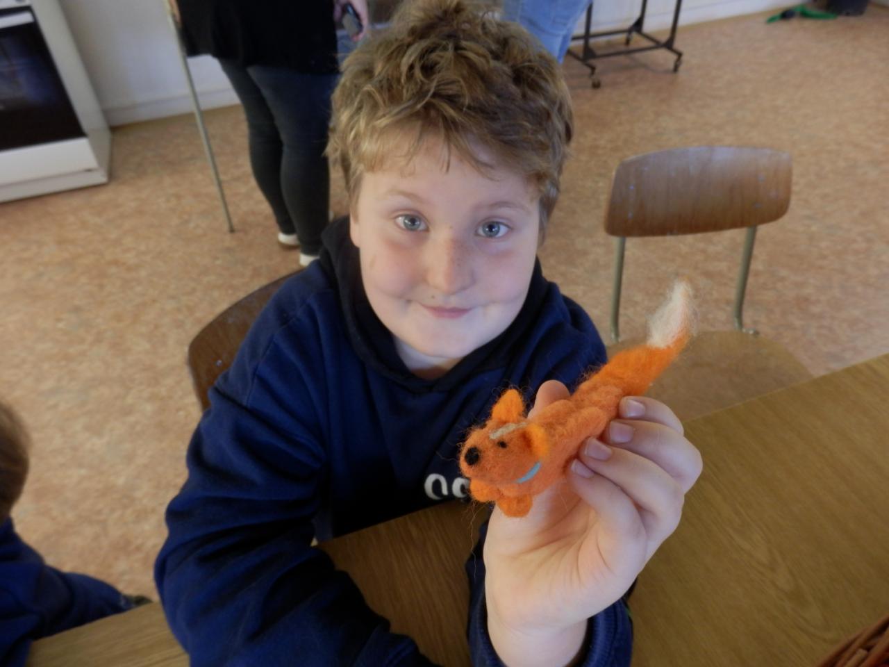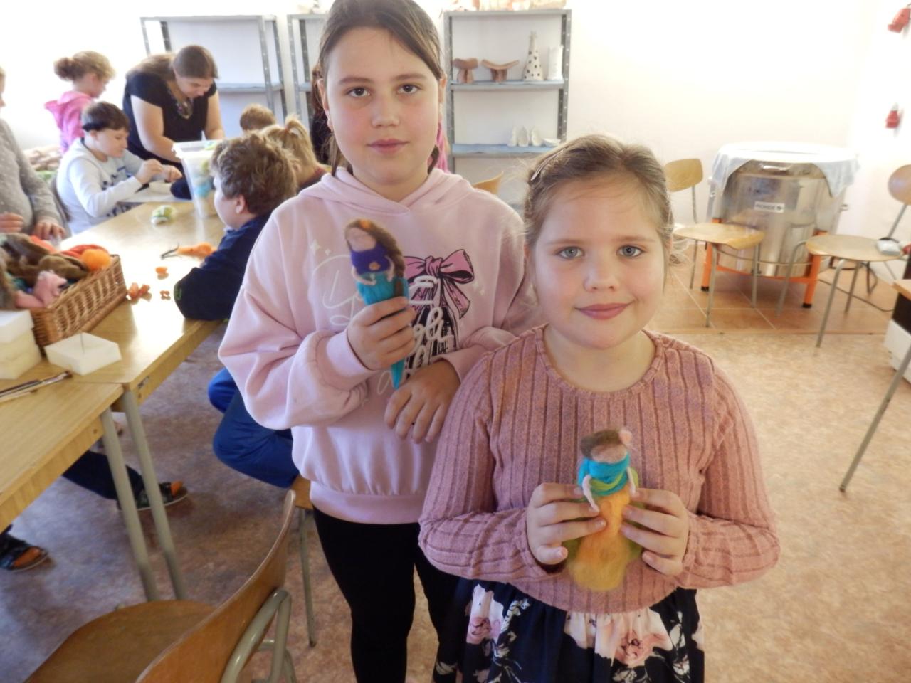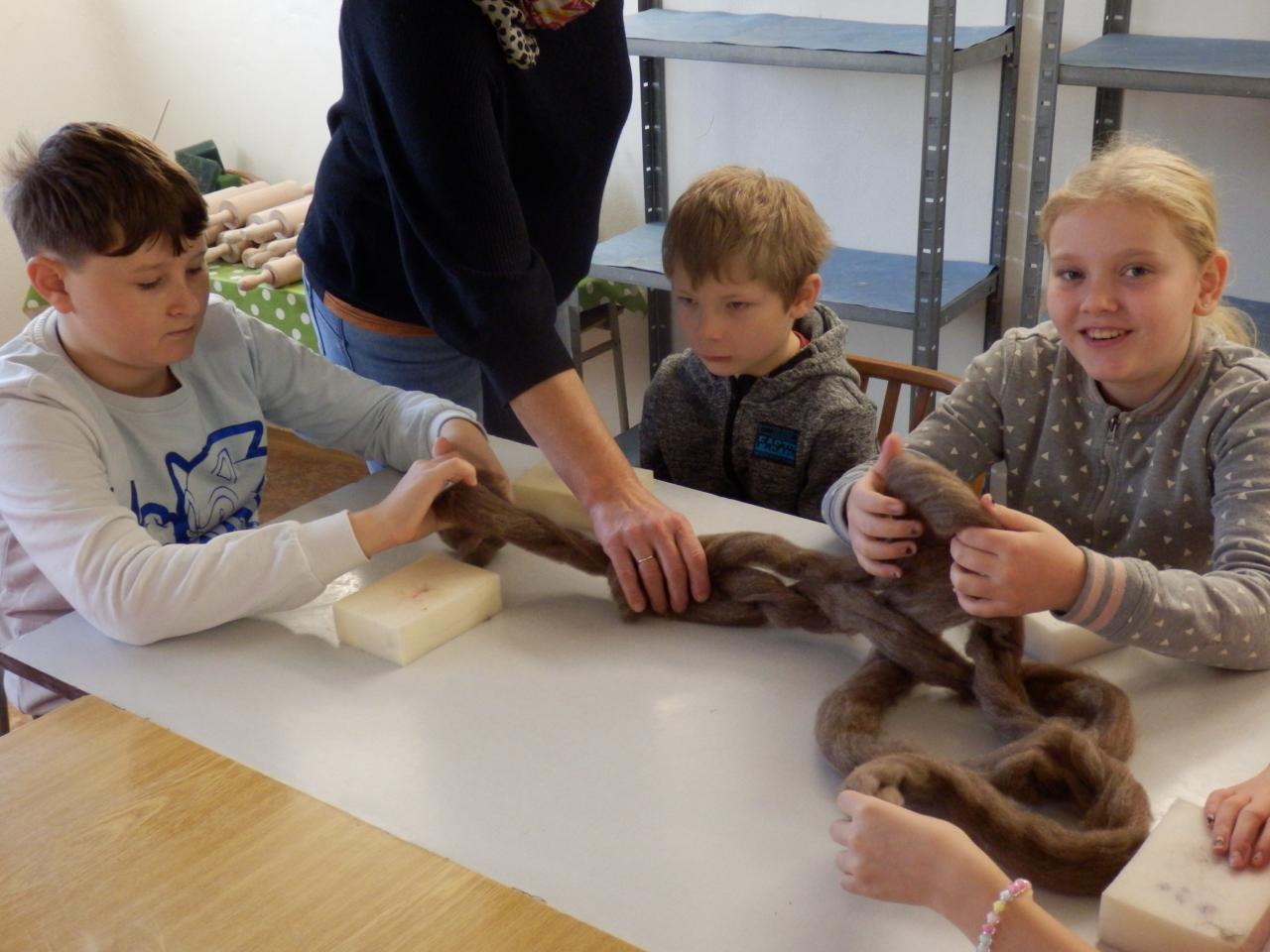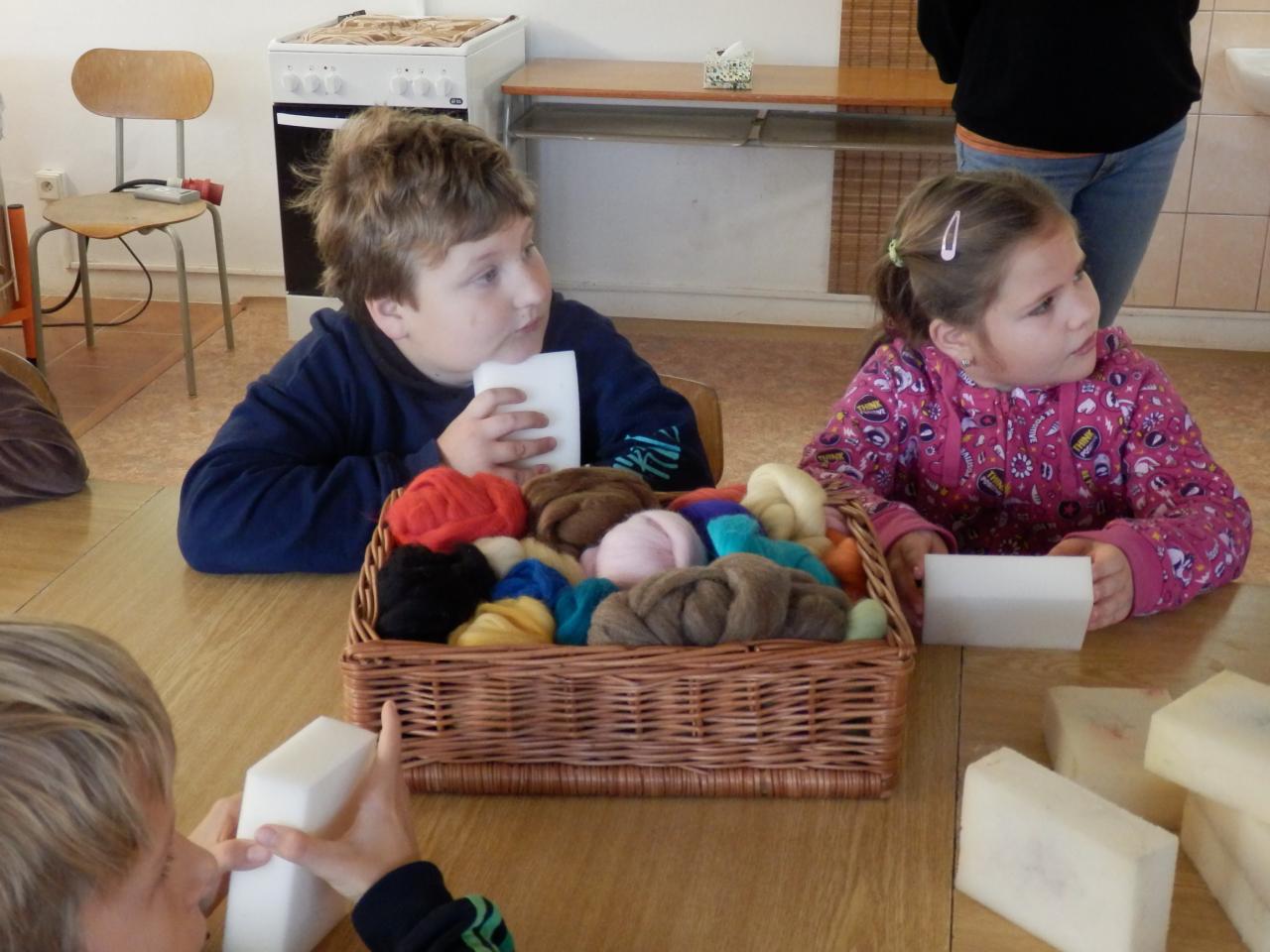 Na úvod paní lektorka Komárková žáky seznámila s materiálem, se kterým budou pracovat. Jednalo se o vlnu z ovcí, která se vyrábí ze surové vlny mykáním. Vlna pak může být přírodní, nebo se může obarvit. Žáci si poté vlnu prohlédli a „osahali“. Pak již následoval výběr toho, co budou vyrábět. Děvčata si vybírala většinou panenku, chlapci spíše zvířátka (prasátko, lišku, kravičku či medvěda). Žáci si vzali obarvenou vlnu, speciální jehlu s háčky, molitanovou podložku a pustili se s chutí do práce – plstění. Během plstění se občas každý jehlou píchl do prstu, ale nakonec výsledkem jejich práce byla hezká zvířátka či panenky-andělky.